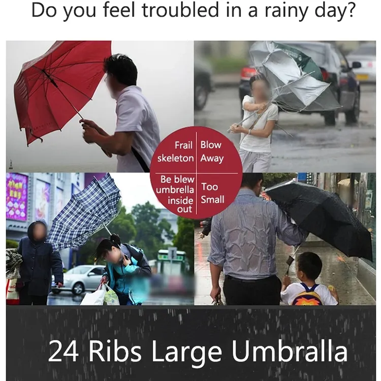 (1) Eccellente resistenza al vento: la struttura a 24 ossei è la più potente garanzia per affrontare un forte tempo del vento, non più preoccupandosi dell'imbarazzo dell'ombrello che viene colpito quando si esce con il tempo piovoso.