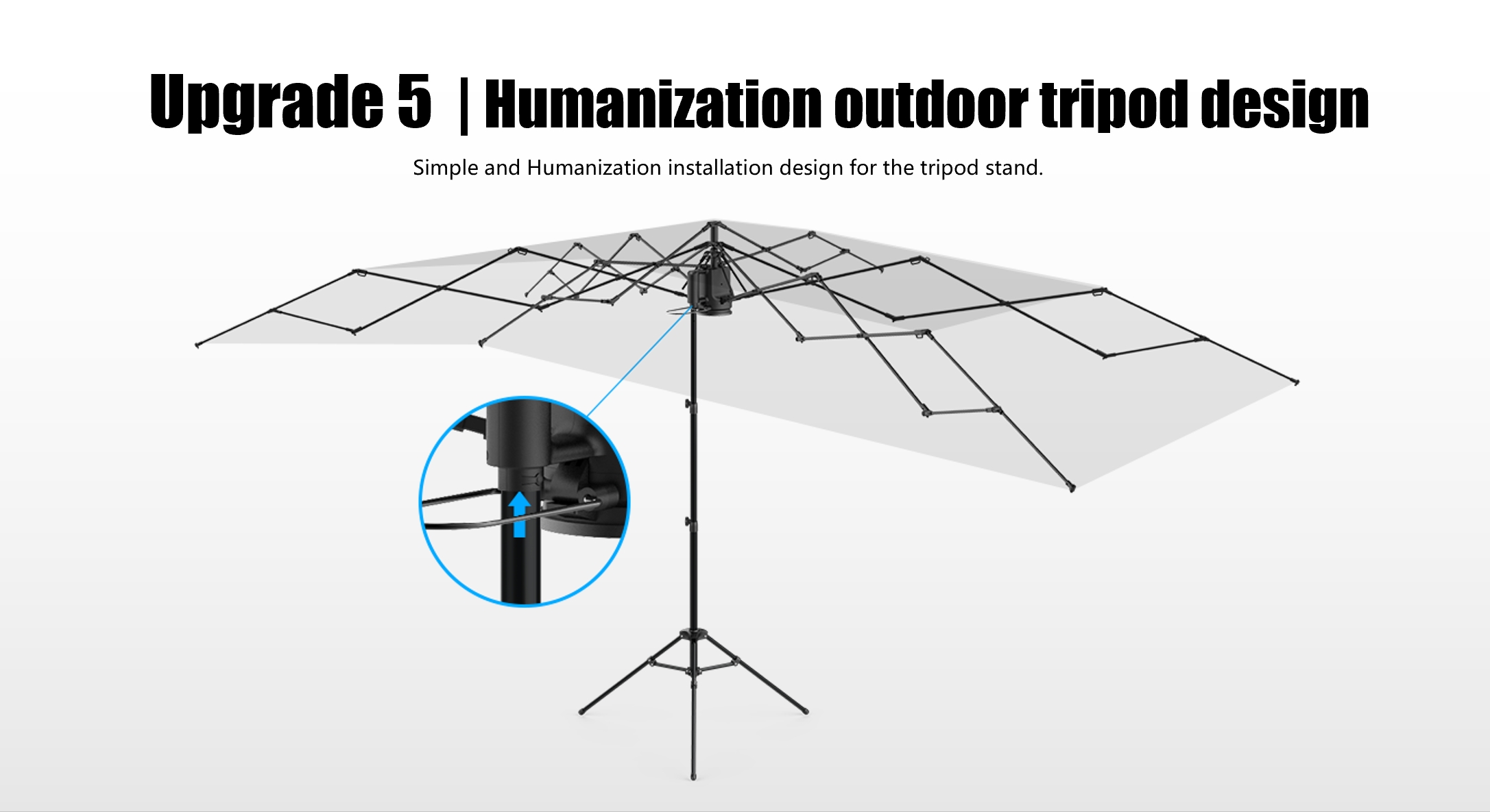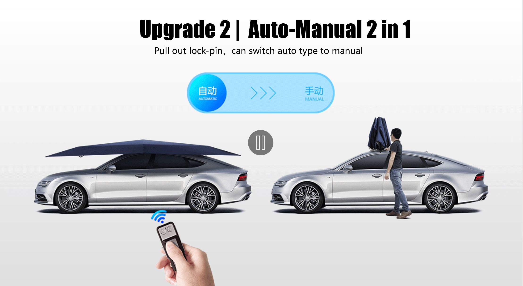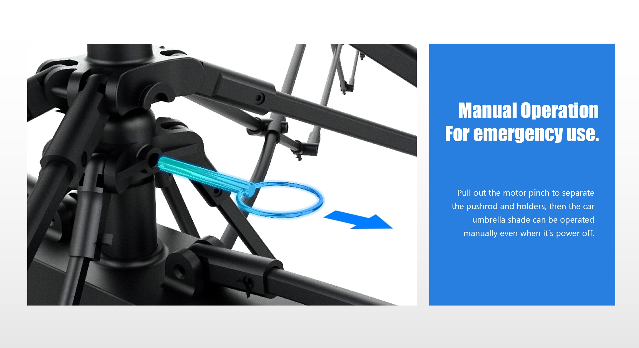 Oltre al sollevamento e all'abbassamento automatico tramite telecomando, è possibile passare in qualsiasi momento anche alla modalità manuale per soddisfare le diverse preferenze. Il motore ottimizzato consuma meno energia ed è più conveniente per la batteria. La struttura del treppiede per esterni appositamente progettata garantisce un'installazione più stabile e consente una rapida installazione all'esterno del veicolo, facilitando la creazione di un parasole temporaneo per i viaggi in campeggio.