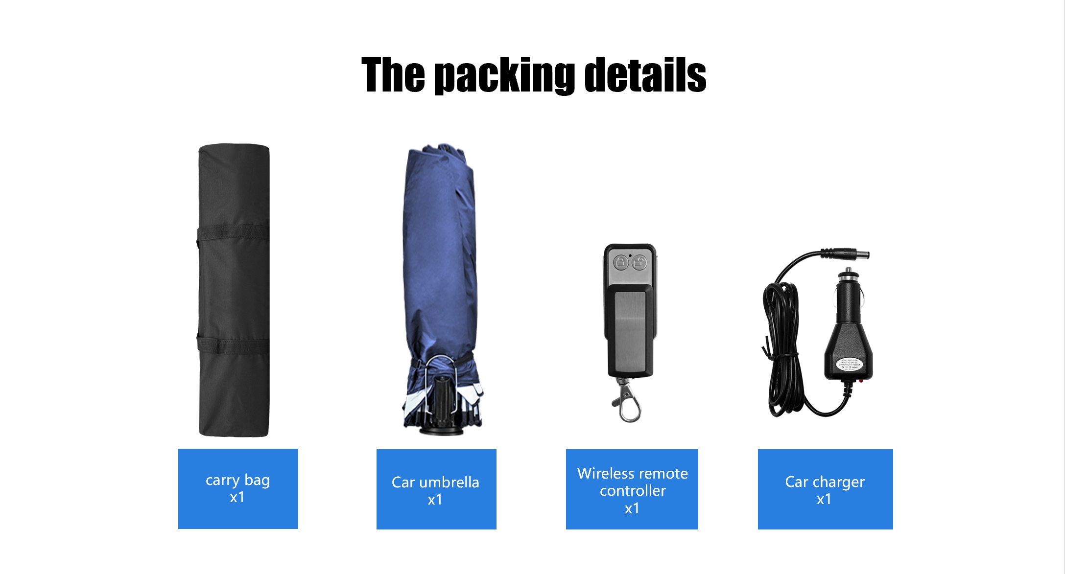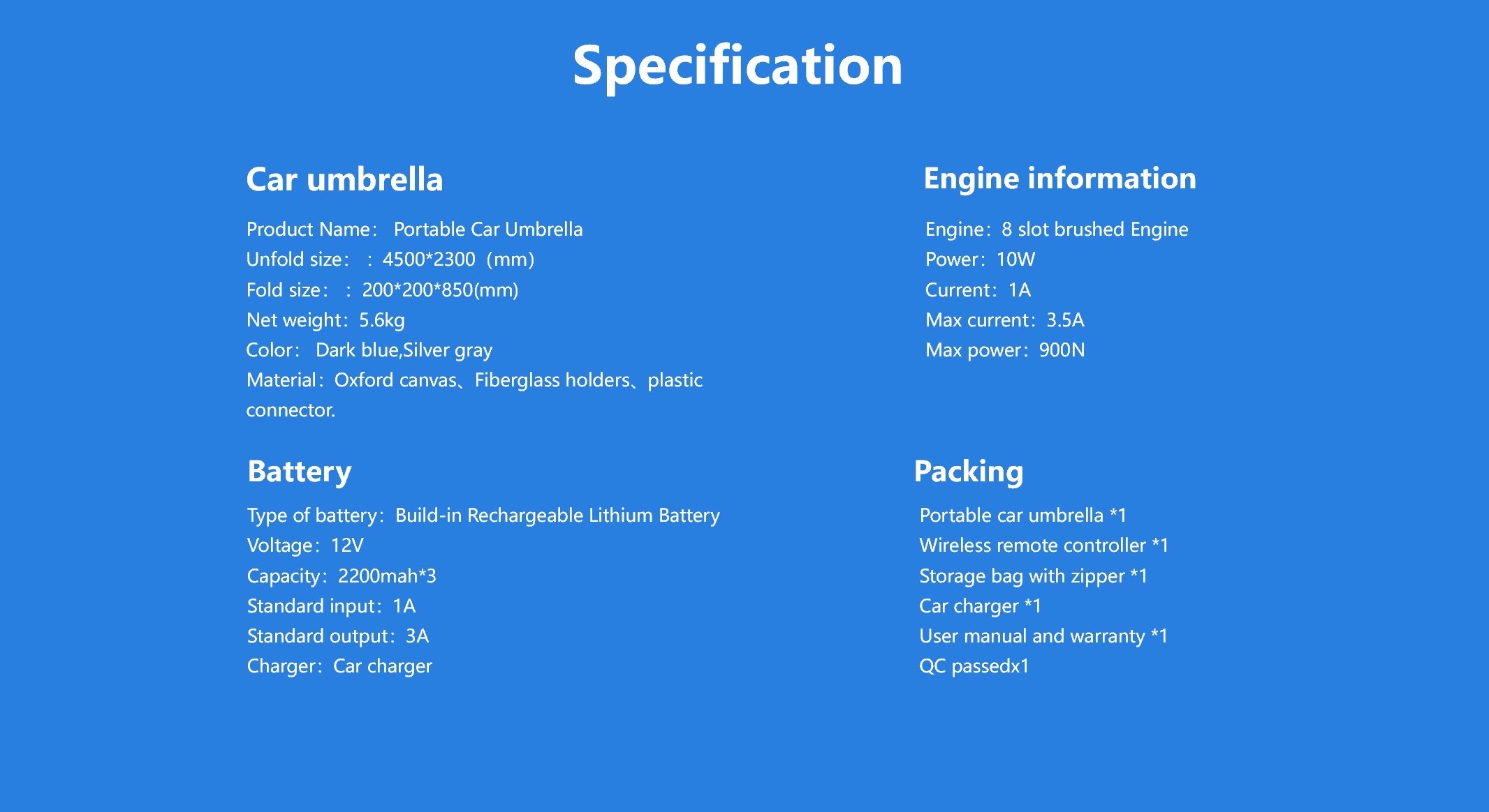 | Accessori | Ombrello per auto portatile x 1, Borsa portaoggetti con cerniera x1, Manuale utente e scheda di garanzia x1. |